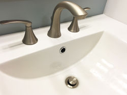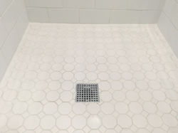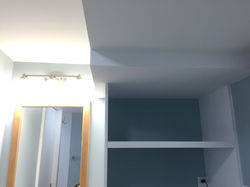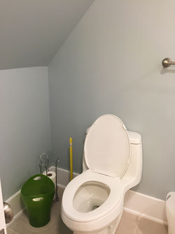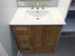 The basement has undergone major renovations including this bathroom and laundry room added to the back. The custom site-built shelving and beautiful tiles altogether cohesively and efficiently utilize the space for a simply elegant area.